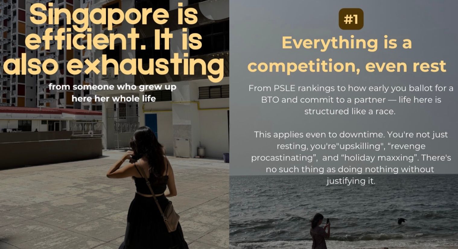 First, “Everything is a competition, even rest. From PSLE rankings to how early you ballot for a BTO and commit to a partner, life here is structured like a race,” she wrote, adding that even during downtime, people feel the need for upskilling or holidaymaxxing.