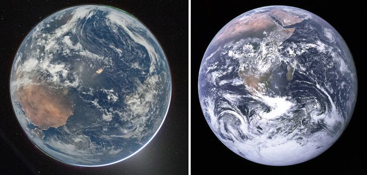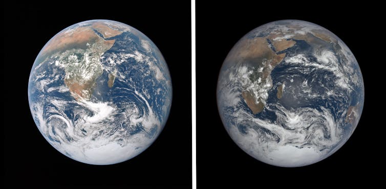 Left: the 1972 Blue Marble image from Apollo 17; right: the 2022 image from DSCOVR. The comparison reveals the effects of deforestation in Madagascar and desertification in the Sahara.