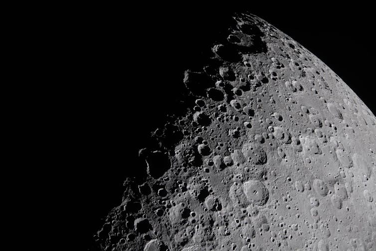 An Artemis II image of the Moon coming into view along the terminator, the boundary between lunar day and night, where low-angle sunlight casts long, dramatic shadows across the surface.