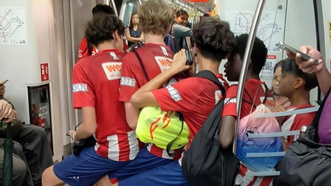 The photo continues to circulate online, drawing both laughter and criticism as viewers weigh in on whether the boys’ antics were harmless fun or a step too far for public transport etiquette.
