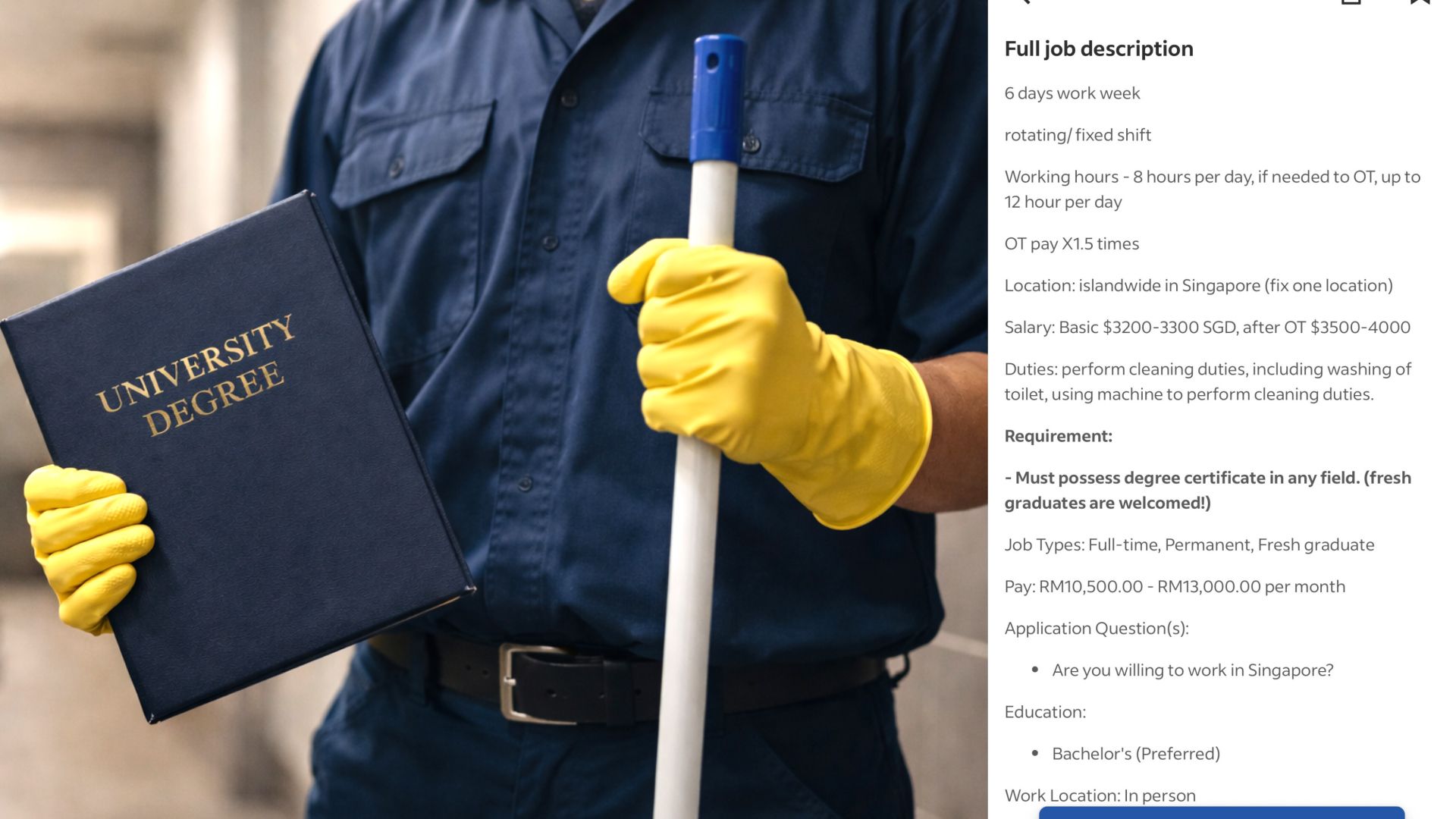 This is where the story becomes more than a viral moment. The listing exposes a labour market under pressure. Employers are balancing costs, quotas, and manpower needs. Workers, meanwhile, are navigating a system in which qualifications can shape access, even in roles that don’t require them.